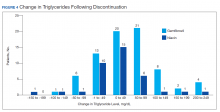 Ultimately, the interaction was resolved for all patients with a gemfibrozil-statin interaction on the STOP report. Following gemfibrozil discontinuation by protocol, 76 patients (80.9%) had TG laboratory results available and were included in the analysis. Sixty-two patients’ (82%) TG levels decreased or increased by < 100 mg/dL (Figure 4), and the TG levels of 1 patient (1.3%) increased above the threshold of 500 mg/dL. The mean (SD) time to the first laboratory result after the pharmacists mailed the notification letter was 6.5 (3.6) months (range, 1-17). The pharmacists spent a mean of 16 minutes per patient resolving each interaction.