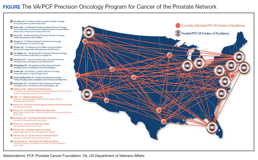 Because prostate cancer is such a significant issue in the VA and best practices for precision oncology can be implemented broadly once defined as successful, the PCF and the VA formed a collaboration to support a network of centers that would focus on implementing a comprehensive strategy for precision oncology in prostate cancer. There are currently 11 centers in the Precision Oncology Program for Cancer of the Prostate (POPCaP) network (Figure). These centers are tasked with comprehensively sequencing germline and somatic tissue from veterans with metastatic prostate cancer to find alterations, which could provide access to treatments that would otherwise not be available or appropriate.