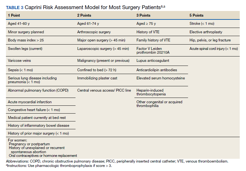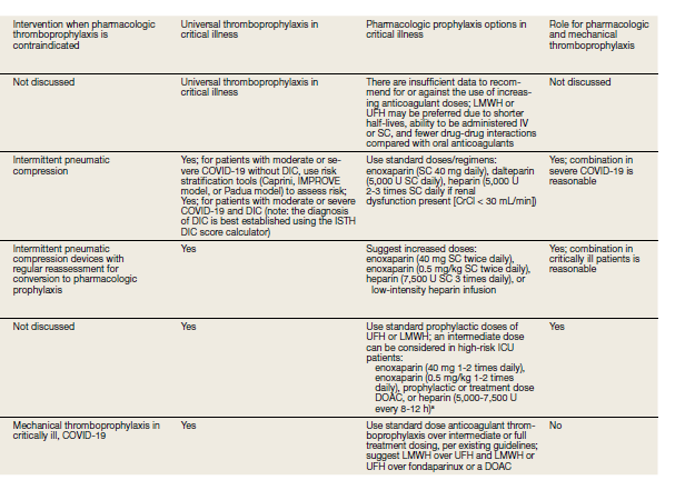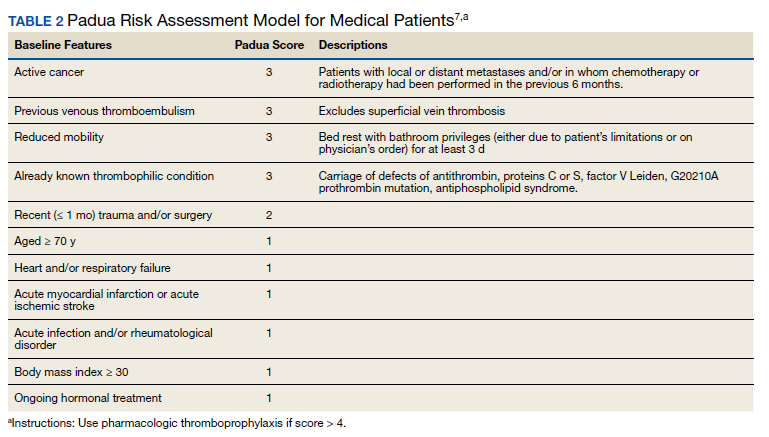 Three thrombosis societies recommend universal pharmacologic thromboprophylaxis for acutely ill COVID-19 patients who lack contraindications.3-5 Others recommend use of risk stratification scoring tools, such as the Padua risk assessment model (RAM) for medical patients or Caprini RAM for surgical patients, the disseminated intravascular coagulation (DIC) score, or the sepsis-induced coagulopathy score to determine therapeutic appropriateness (Tables 2 and 3).1,2 Since most patients hospitalized for COVID-19 will present with a pathognomonic pneumonia and an oxygen requirement, they will generally achieve a score of ≥ 4 when the Padua RAM is applied; thus, representing a clear indication for pharmacologic thromboprophylaxis.8,9 If the patient is pregnant, the Anticoagulation Forum recommends pharmacologic prophylaxis, consultation with an obstetrician, and use of obstetrical thromboprophylaxis guidelines.3,10,11
