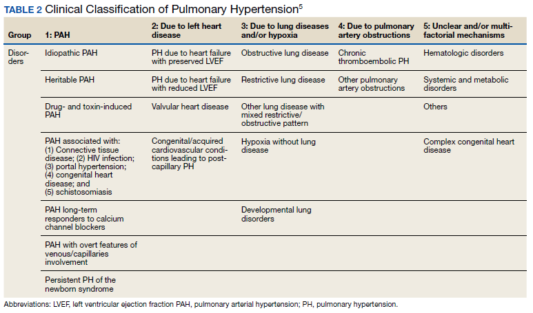 ►Dr. Goldstein: PH may be secondary to a wide variety of disorders including left heart disease (Group 2), advanced COPD, interstitial fibrosis, obstructive sleep apnea (OSA), or other lung diseases (Group 3), thromboembolic disorders (Group 4), and other systemic diseases such as sarcoidosis (Group 5). Group 1 is pulmonary arterial hypertension. (Table 2).