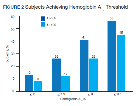 Overall, more subjects in the U-500 group than in the U-100 group achieved Hb A1C levels < 8.5% (56% vs 46%, respectively, P = .003) and the proportion of subjects achieving Hb A1C levels < 7.5% doubled that of the U-100 group (26% vs 12%; Figure 2). Five subjects in the U-500 group experienced severe hypoglycemia, compared with 1 in the U-100 group (P = .08). The total daily insulin dose was significantly higher in the U-500 group (296 units daily) than in the U-100 group (209 units daily) (P < .001) (Table 2). Baseline weight and BMI differences were also significant for the U-500 and U-100 groups (P < .001). Weight gain of approximately 2 kg occurred in both groups, a change that was not statistically significant (P = .79)