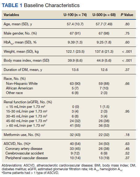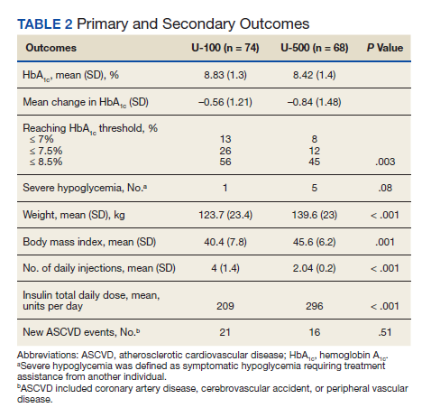Both groups had similar initial Hb A1C baselines (> 9%) and both improved glycemic control during the study period. However, the Hb A1C reduction was greater in the U-500 group (P= .034), 0.84% vs 0.56% for U-100 and the between-groups difference was 0.4%. (Figure 1, Tables 2 and 3).