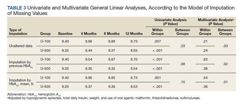 The univariate general linear model shows a statistically significant difference in the levels of Hb A1C within each treatment group, regardless of the imputation strategy. However, the differences were not significant when comparing postintervention Hb A1C means between groups with unaltered data (P = .23), because the U-500 group Hb A1C improvement gap narrowed at the end of study. In the multivariate analysis, irrespective of imputation method, the differences in Hb A1C between group treated with U-100 and U-500 were statistically significant (Table 3).