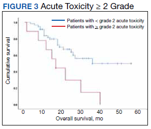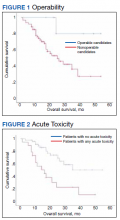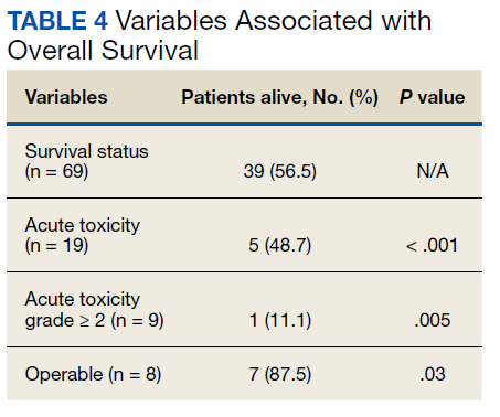 At the time of data collection, 30 patients were deceased (43.5%). There was a statistically significant association between OS and operability (P = .03; Table 4, Figure 1). Decreased OS was significantly associated with acute toxicity (P = .001) and acute toxicity grade ≥ 2 (P = .005; Figures 2 and 3). For the inoperable patients, both acute toxicity (P < .001) and acute toxicity grade ≥ 2 (P = .026) remained significant.