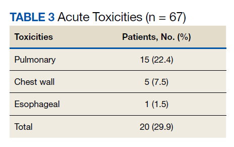 Nineteen of 67 patients (26.3%) had acute toxicity of which 9 had acute grade ≥ 2 toxicity; information regarding toxicity was missing on 2 patients. Thirty-two of 65 (49.9%) patients had late toxicity of which 20 (30.8%) had late grade ≥ 2 toxicity. The main factor associated with development of acute toxicity was pretreatment oxygendependence (P = .047). This was not significant when comparing only inoperable patients. Twenty patients (29.9%) developed some type of acute toxicity; pulmonary toxicity was most common (22.4%) (Table 3). All patients with acute toxicity also developed late toxicity except for 1 who died before 3 months. Predominantly, the deaths in our sample were from causes other than the malignancy or treatment, such as sepsis, deconditioning after a fall, cardiovascular complications, etc. Acute toxicity of grade ≥ 2 was significantly associated with late toxicity (P < .001 for both) in both operable and inoperable patients (P < .001).