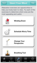 Within the second section, “Quiet Your Mind,” the app notes, “relaxation exercises are opportunities to help your body learn to relax.” The only list in this section is for winding down, making room in the menu for exercises and activities. Among these are perspective changes, which offer affirmations such as “I have been through many hard things in my life and survived” and “I will survive even if I don’t sleep at all tonight” in response to concerns over worrying about sleep and thinking about trauma; a breathing tool; a progressive muscle relaxation exercise; a 4-minute guided imagery exercise, available through forest, country road, or beach scenes; and 7 to 9 minute exercises for observing thoughts and sensations.Another tool focuses on preventing insomnia, offering a self-administered quiz to determine personal areas that may need improvement. As the user grows more comfortable with the CBT-i Coach and uses it over a period of time, sleeping difficulties may still naturally return. The app reinforces “this is normal” and provides the quiz as a way for users to keep tabs on themselves and their habits to determine why their sleeping difficulties may have returned.