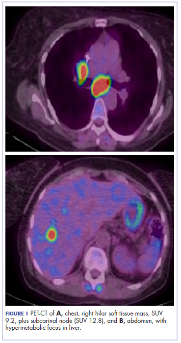The patient underwent a CT-guided core biopsy of the spiculated nodule, which was found to be consistent with adenocarcinoma of the lung. It was negative for EGFR mutation or ALK rearrangement. She received stereotactic radiosurgery to the left posterior parietal lesion, and after completion of radiation, was started on systemic chemotherapy with cisplatin plus pemetrexed for adenocarcinoma of the lung. She received 4 cycles of chemotherapy. Repeat imaging with a PET-CT showed interval increase of the mediastinal hypermetabolic lymphadenopathy with new hypermetabolic pretracheal lymph nodes and interval development of multiple liver metastases in the right and left lobes of the liver (Figure 1). She was started on second-line therapy with nivolumab at a dose of 240 mg every 2 weeks. The treatment was complicated initially by new onset grade 2 papular pruritic rash after cycle 2 of therapy. The rash involved the upper and lower extremities, sparing the palms, soles, trunk, abdomen, and the back. It resolved with treatment delay and topical steroids.