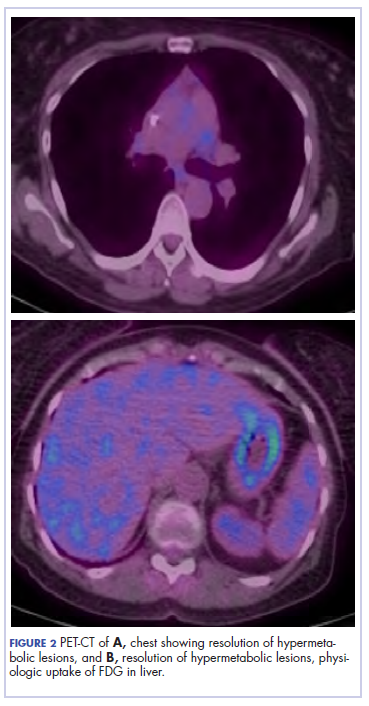 The patient resumed treatment with nivolumab after complete resolution of the rash. However, she developed grade 2 nephritis after cycle 5 with a creatinine level of 1.98 mg/dL (reference range, 0.6-1.2 mg/ dL). This was resolved after treatment with oral prednisone, at a starting dose of 1 mg/kg and tapered over 4 weeks. PET CT scans obtained after cycles 5 and 11 showed no metabolic activity in the mediastinum or the liver and markedly decreased uptake in the right lower lobe nodule, down to an SUV of 1.7 with no new nodules. An MRI of the brain was stable (Figure 2).