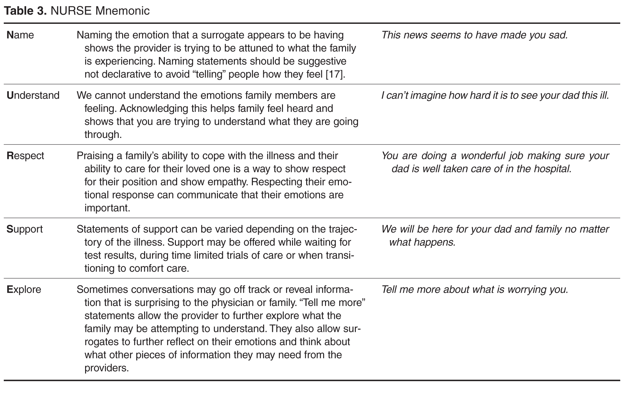 NURSE is a helpful mnemonic for different ways to respond to emotion [16]. NURSE stands for 5 separate skills that can be used in these situations: name, understand, respect, support, and explore. Table 3 provides guidance on using NURSE and offers examples of NURSE statements.5. Highlight the Patient’s Voice