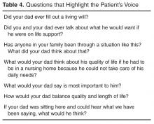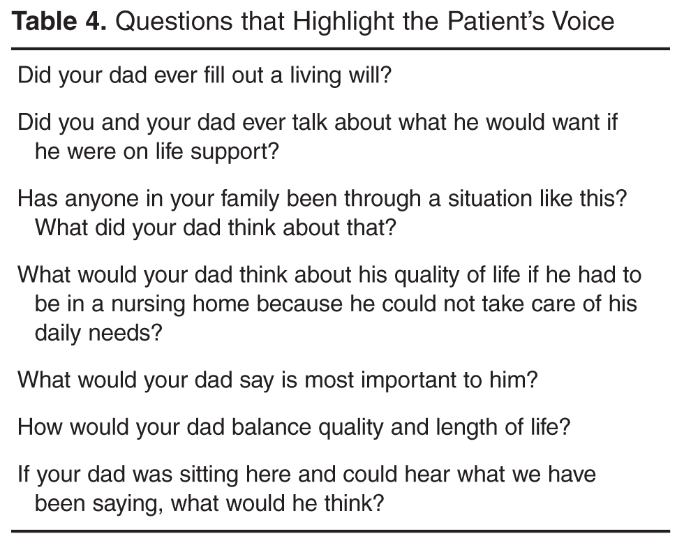 Clinicians have a responsibility to attend to surrogates’ emotions, to help educate surrogates regarding their role, and to explore the patient’s values. One way to focus on the values of the patient is “highlighting the patient’s voice.” This requires asking questions that help the surrogate focus on the patient, her values and her attitude toward serious illness. There are many questions a provider can use to elicit a critically ill patient’s values ( Table 4 ). You may have to use a variety of different questions to understand what is most important to the patient.As families reflect on their loved one’s values, conflicting desires will arise. For example, someone may have wanted to live as long as possible and also values independence. Or someone may value their ability to think clearly more than being physically well but would not want to be physically dependent on artificial life support. Exploring which values would be more important can help resolve these conflicts.