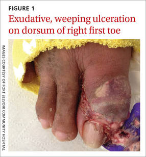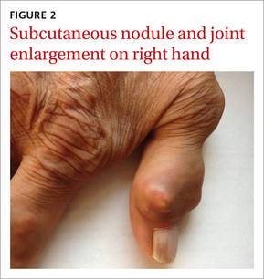 The patient was thin, alert, oriented, and in no acute distress. His vital signs and a cardiopulmonary exam were normal. The patient’s right great toe was tender to touch, with ulceration of the skin dorsally at the proximal nail fold. In addition, his toe was oozing a purulent, non-foul smelling discharge (FIGURE 1). Other pertinent findings included multiple enlarged joints on both hands with visible yellow-white subcutaneous nodules on the hands and dorsum of the forearm (FIGURE 2).