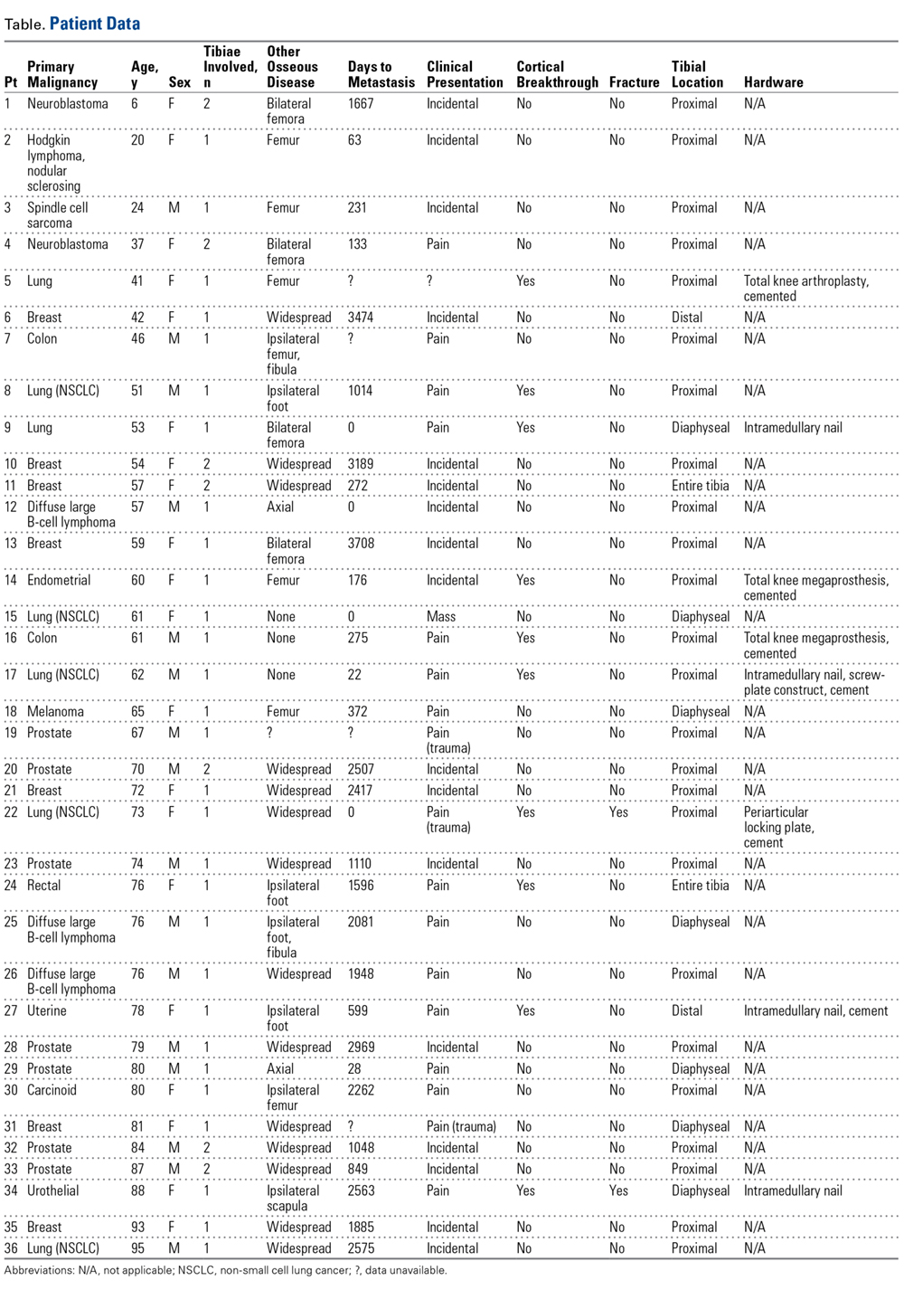 Time to metastasis was defined as number of days from diagnosis of malignancy to diagnosis of tibial osseous spread. Date of diagnosis of malignancy was the date that a biopsy or other confirmatory test was performed. In cases in which that date was unavailable, an imaging study consistent with disease or a clinical note documenting the known diagnosis date was used instead. When only month and year (ie, not an exact date) of diagnosis were available, the 15th of the month was used as an estimate. Of the 36 patients, 4 had records insufficient for establishing date of diagnosis. The first date of any imaging study confirming (or suggestive of) a metastatic lesion of the tibia was used as the date of tibial metastasis.