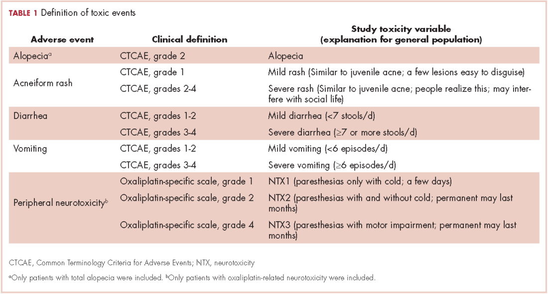 Five AEs related to systemic treatment of cancer – alopecia, acneiform rash, oxaliplatin-associated peripheral neuropathy, diarrhea, and vomiting – were selected for the study. Investigators set up different relevant cut-off points for severity, resulting in 10 toxic events that were ad hoc defined as the variables for the study (Table 1). We used the Common Terminology Criteria for Adverse Events (CTCAE, version 4) to classify alopecia, acneiform rash, diarrhea, and vomiting. For oxaliplatin-associated peripheral neuropathy, we adapted Misset’s oxaliplatin-specific scale11 (range, grade 1-4; Table 1) in which grade 1 (neurotoxicity [NTX] 1) = paresthesias only with cold lasting a few days; grade 2 [NTX2] = paresthesias with and without cold that may last months; and grade 4 [NTX3] = paresthesias with functional consequence).