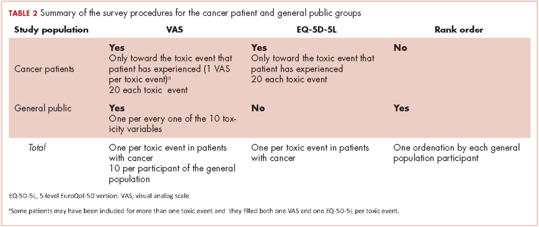 There are some limitations in the present study. First, we modified slightly the EQ-5D-5L questionnaire by asking patients to recall and rate the days they experienced the adverse event instead of asking for “today’s feelings.” It is not known how this modification affects internal validity of this study. Second, we asked patients to isolate the toxic event to rate it independently from the other toxic events. We believe that this request may have been difficult for some patients to do because they might have experienced more than 1 toxic event concurrently. Third, using VAS to assess health status may be a weakness because it has been considered to be too straightforward an instrument. Likewise, there are some strengths of the study: it was performed in a face-to-face manner; it displayed cardinal and ordinal results for participants in the public group; and the results are the same as those in a previous study.14