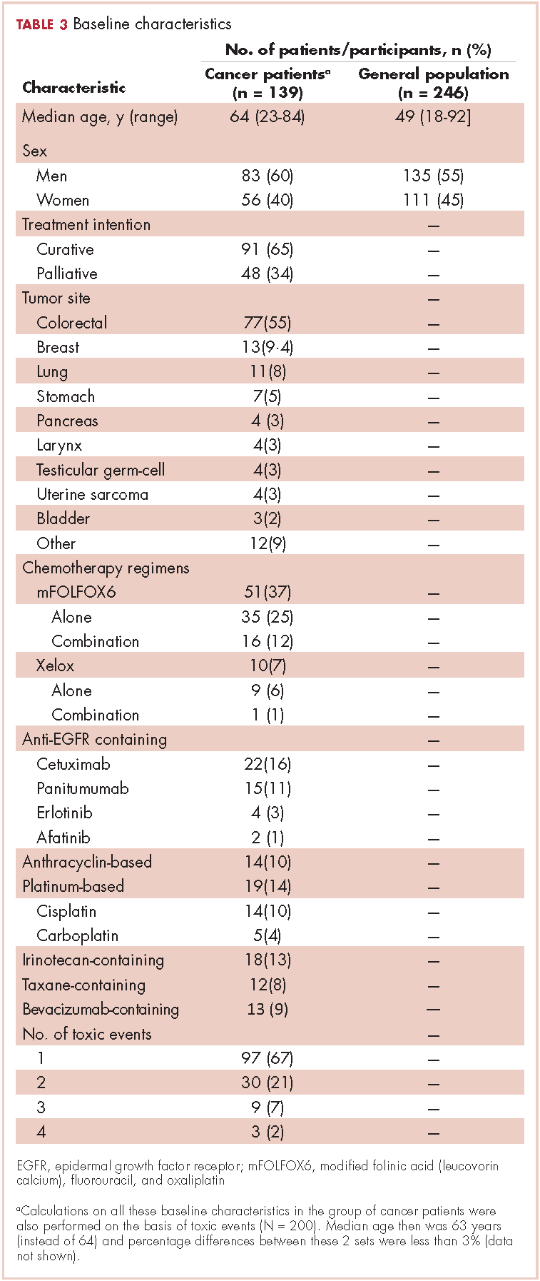 Between December 1, 2013 and January 31, 2015, a total of 250 participants of the general public and 139 cancer patients were included in the study. Four participants of the general public had incompletely filled the questionnaire and were excluded from the study, resulting in 246 participants with complete data available. There were no losses in the patient group, of whom 79 (57%) were currently on treatment and 118 (85%) had received the treatment in the previous 2 years. The total number of study toxic events in the 139 cancer patients was 200 (20 by each of the 10 study toxicity variables). Of those, 42 patients (30%) experienced (and were included in the study for) more than 1 toxic event.