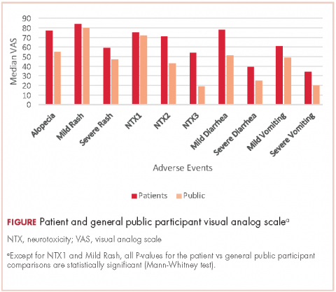 Three previous studies have addressed the comparison of the impact of different AEs in these 2 populations and findings from all 3 showed the same systematic difference between patients and the general public participants. The first, Calhoun and colleagues used time to trade-off (TTO, a measure of the QoL a person or groups is experiencing) to compare therapies for ovarian cancer in patients and the general population (n = 39 for each group). The results showed that cancer patients valued more the health status associated with toxicity than did the general public participants.13 The design of the second study, by Havrilesky and colleagues, was similar to that of the present study, and they compared toxic events one by one, using VAS and TTO in 13 ovarian cancer patients and 37 women of the general public.14 The investigators found the same results as we did on the parallel of the 2 groups and also a very similar order of the toxic events. Indeed, alopecia was the less bothersome, whereas both motor neuropathy and severe vomiting were among the worst toxic events. Therefore, our results correlate perfectly with theirs. Best and colleagues found that health states values associated with oxaliplatin-related peripheral neuropathy were lower in the general public population compared with those of cancer patients.15 Besides adaptive behavior of the patients, all these results may be explained by an established awareness cancer patients have of the dual outcome of cancer treatments (AEs and benefits from the treatment).9 This awareness is absent in the general public participants, who can only envision the negative outcomes and who do not realize the importance of the benefits.9 Findings from previous studies conducted in several tumor types such as breast cancer16-18 non–small-cell lung cancer,19 thyroid cancer,20 and renal cancer21 have shown that patients are willing to trade-off AEs for treatment benefits.