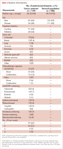 Of the 139 patients, 91 (65%) received the treatment with curative intent. The most frequent diagnosis was colorectal cancer in 77 patients (55%), followed by breast cancer (13 patients, 9.4%), and lung cancer (11 patients, 7.9%). Systemic treatment of cancer was one of these options: chemotherapy alone, anti-EGFR [epidermal growth factor receptor] alone, chemotherapy plus anti-EGFR, or chemotherapy plus other biologics. The chemotherapy regimen most frequently administered was mFOLFOX6 [modified leucovorin calcium (folinic acid), fluorouracil, and oxaliplatin] which, alone or in combination, was administered to 51 patients (37%). An anti-EGFR agent was administered to 22 patients (16%): cetuximab (15 patients), panitumumab (4 patients), erlotinib (2 patients) and afatinib (1 patient). The baseline characteristics of the patients and participants in the study are shown in Table 3.