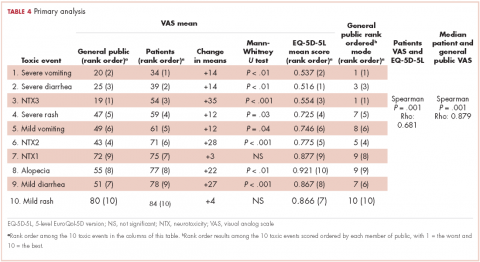 Taking off 2 mild effects (NTX1 and mild rash), for the 8 remaining toxic events, this difference was statistically significant (Mann-Whitney U test; P < .01 for severe vomiting, severe diarrhea, and alopecia; P < .001 for NTX2, NTX3 and mild diarrhea; P = .03 for severe rash; P = .04 for mild vomiting). Severe vomiting resulted in the worst VAS score for cancer patients (median VAS, 34) and NTX3 had the worst VAS score for the general public participants (median, VAS 19). Table 4 summarizes the 4 sets of results (patient and public VAS, and patient EQ-5D-5L and public rank-order). Regarding the results of the esthetic toxicities compared with each other, impact from severe rash was considered higher than that from alopecia for both populations, patients (mean VAS, 59 [rash] vs 77 [alopecia]; mean EQ-5D-5L score, 0.725/rank order 4 vs 0.921/10) and the general public (mean VAS, 47 vs 55; EQ-5D-5L, rank order 5 vs 9). In the group of patients, linear correlation between VAS and EQ-5D-5L score was assessed resulting in a significant positive correlation (Spearman P = .001) with a correlation coefficient Rho 0.681 (Appendix 3 [online only]). Also, a positive linear correlation was observed between the 10 means of the cancer patients’ VAS and the 10 means of the general public participants’ VAS (Spearman P = .001; coefficient Rho 0.879). Both ceiling and floor effect were observed for VAS in the 2 populations, but only ceiling effect for EQ-5D-5L in the patient population. The most important floor effect was for NTX3, with 66 participants (27%) of the general public group scoring VAS 0 (see Appendix 4 [online only] for the frequencies of answers for every level of the 5 dimensions of the EQ-5D-5L). An analysis of the results, considered as an intraparticipant rank-ordered evaluation, was performed in the general public group. Fourteen participants of that group (5.7%) changed their scores after they were presented with the order shown in cards. Mode of the ranks show that NTX3 and severe vomiting were the worst-scored toxic events. The most frequent rank-order for alopecia and severe rash were (from best to worst) the second and the fourth, respectively.