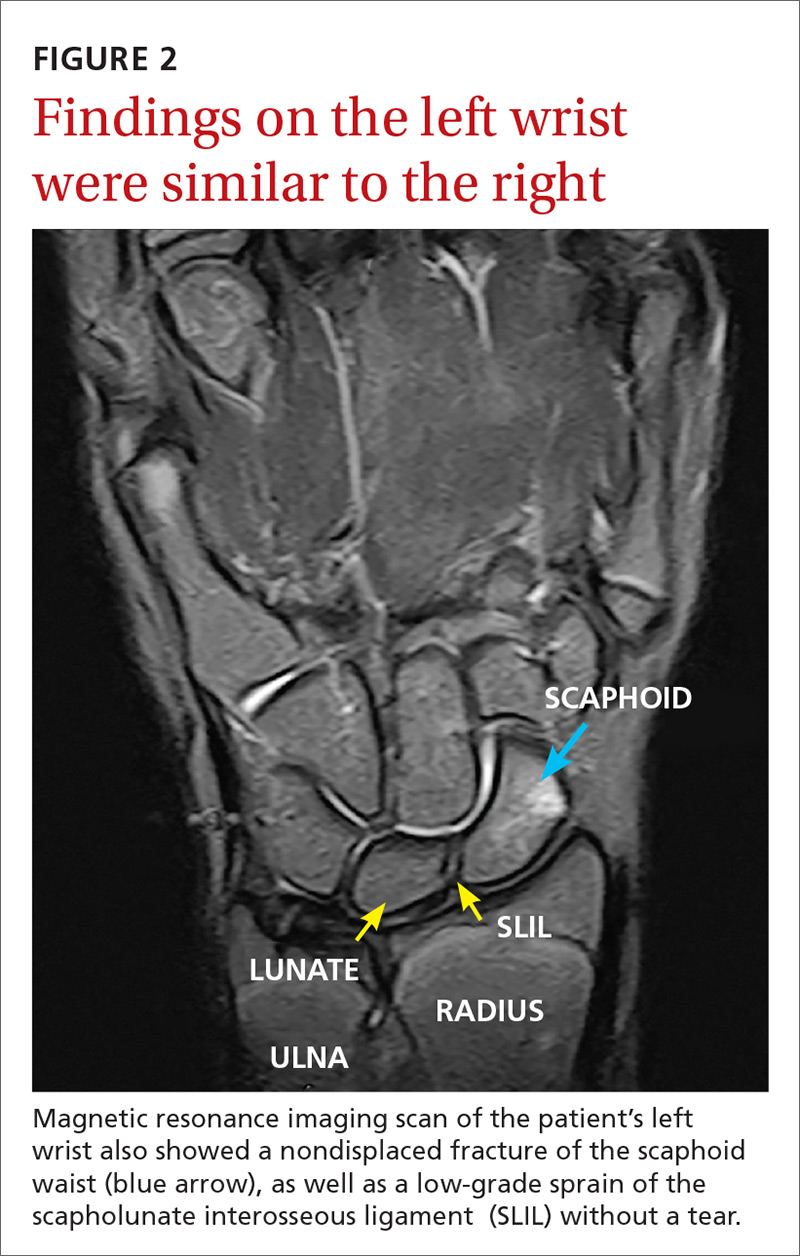 The MRI revealed bilateral, nondisplaced, extra-articular fractures extending through the scaphoid waist, with surrounding bone marrow edema. In the right wrist, the patient also had a low-grade partial tear of the membranous portion of the scapholunate interosseous ligament (SLIL) at the scaphoid attachment (FIGURE 1). In the left wrist, she also had a low-grade sprain of the SLIL without tear (FIGURE 2).