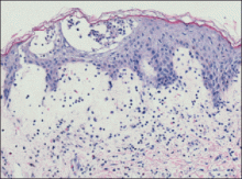 Histologic examination revealed intraepidermal neutrophils with focal aggregation into subcorneal pustules. Papillary dermal edema was prominent with a superficial perivascular and interstitial inflammatory infiltrate of lymphocytes, neutrophils, and numerous eosinophils (Figure 2). These findings were consistent with acute generalized exanthematous pustulosis (AGEP). All blood cultures were negative. Within a few days the edema and erythema subsided, leaving desquamating erythematous patches. The patient’s other medications included simvastatin, citalopram, levothyroxine, hydrocortisone cream, celecoxib, and pramipexole, all of which she had been taking for at least 3 years. She also was taking oxycodone hydrochloride and warfarin, which were initiated after the knee replacement. Based on the patient’s history as well as the clinical and histologic appearance, she was diagnosed with daptomycin-induced AGEP.