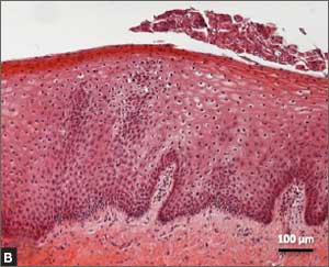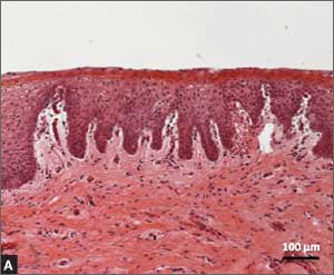 Recently published histology data highlight significant changes 1 month after fractional CO2 laser treatment that included a much thicker epithelium with wide columns of large epithelial cells rich in glycogen.21 Also noted was a significant reorganization of connective tissue, both in the lamina propria and the core of the papillae (FIGURES 1 and 2).