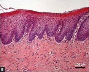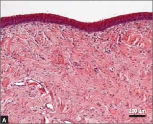 FIGURE 1: Early-stage vaginal atrophy This histologic preparation of vaginal mucosa sections reveals untreated early-stage vaginal atrophy (A), with thinning epithelium and the presence of papillae, and the same mucosa 1 month after treatment with fractional CO2 laser therapy (B). Reprinted with permission from DEKA M.E.L.A. Srl (Calenzano, Italy) and Professor A. Calligaro, University of Pavia, Italy. |