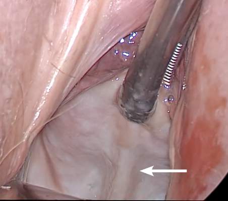 I like to use a bit of electrosurgery to incise the vaginal wall. I don’t begin at the cervix but incise more distally into the vaginal epithelium approximately 2 cm from the cervicovaginal junction. This strategy prevents dissection into the cervix and/or rectovaginal septum rather than the posterior cul-de-sac (FIGURE 3).