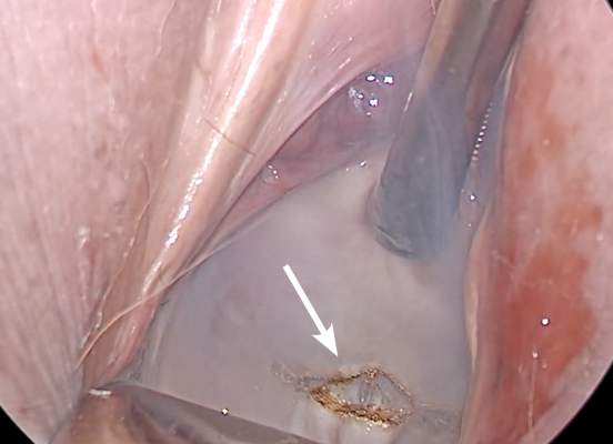 In a nulliparous patient or a woman with a tight pelvis, you may discover that the peritoneum is pulled up between the uterosacral ligaments. One common pitfall arises when the surgeon, having dissected the vaginal epithelium, continues cutting into the vaginal epithelium instead of reaching into the peritoneal cavity. Palpate the tissue to ensure that there is no bowel in the way and stay at right angles while confidently grasping the peritoneum with a toothed forceps.