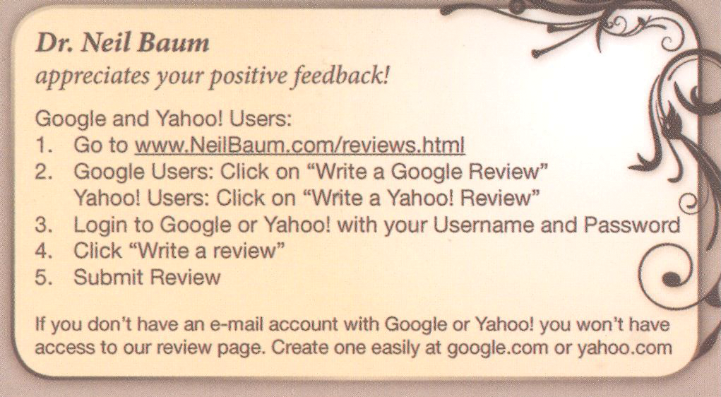 Keep the process simple. Capture positive compliments at the point of service. Before a patient leaves your office, hand her a card (FIGURE) with easy steps for posting an online review, or offer her a tablet that links directly to your website review section. If your patient is not computer savvy, ask her to complete a 4- to 5-question survey and give her a clipboard and a pen. Then have a staff member post it on your website.