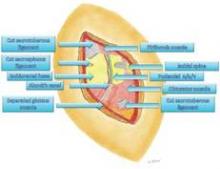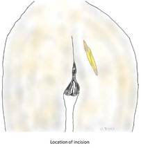 An incision of approximately 7-10 cm in length is made across the gluteal region overlying the sacrotuberous ligament. The gluteus muscles are spread, with muscle fibers separated longitudinally, and once the ligament is reached, it is transected at its narrowest point.