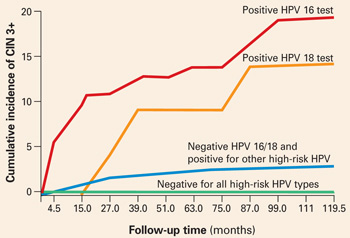 Women positive for other high-risk types of HPV, but negative for HPV 16 and 18 had far less risk: only 3% developed CIN 3+.