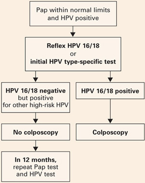 - Women positive only for other high-risk types could be reassured of the safety of a 12-month interval without colposcopy, and referred to colposcopy only if the repeat Pap shows worse than atypical squamous cells of undetermined significance (ASC-US) or the HPV test is again positive (FIGURE 2).
