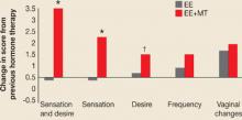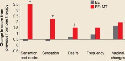 We have known for years that androgen—not estrogen—is associated with satisfactory sexual function. Although estrogen replacement increases vaginal lubrication, it is androgen, most commonly in the form of oral methyltestosterone or injectable testosterone, that increases frequency of intercourse, desire, and sexual sensation (FIGURE 2).10 The definition of androgen insufficiency has been hotly debated, and is currently “a pattern of clinical symptoms in the presence of decreased bioavailable testosterone and normal estrogen.”11
