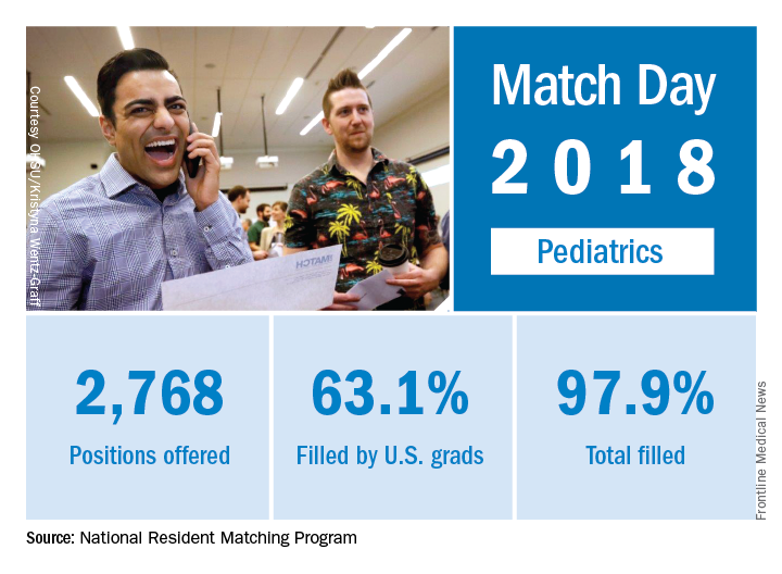 Available pediatric PGY-1 slots rose 1.1% to 2,768 for 2018, and total slots filled were up just 0.7% to 2,711 – those totals ranked third among all specialties in each category. The fill rate for U.S. graduates dropped for the third year in a row to 63.1%, and the overall fill rate was 97.9%. For all specialties, U.S. graduates filled 58.7% of the record-high 30,232 available spots, and the overall fill rate was 96.1%, the NRMP reported.The 2018 Match also set new highs for total positions offered (up 4.4% over last year), total positions and PGY-1 positions filled (up 4.7% and 4.9%, respectively), and total applicants (up 1.7%). “The results of the Match are closely watched because they can be predictors of future physician workforce supply. There also is significant interest in the competitiveness of specialties, as measured by the percentage of positions filled overall and the percentage filled by senior students in U.S. allopathic medical schools,” the NRMP said.