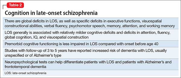 Rajji et al7 performed a meta-analysis comparison of patients with youth-onset schizophrenia, adults with first-episode schizophrenia, and those with LOS on their cognitive profiles. They reported that patients with youth-onset schizophrenia have globally severe cognitive deficits, whereas those with LOS demonstrate minimal deficits on arithmetic, digit symbol coding, and vocabulary but larger deficits on attention, fluency, global cognition, IQ, and visuospatial construction.7