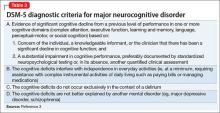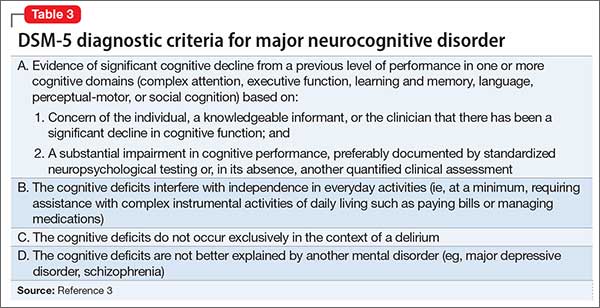 Clinical assessment (Figure) and standardized tests revealed the presence of neurocognitive deficits sufficient to meet criteria for major neurocognitive disorder (Table 33). The pattern of neurocognitive deficits is consistent with an AD-like amnestic picture, although no clear-cut diagnosis was present, and the neurocognitive disorder was better classified as unspecified rather than of a particular type. It remains uncertain whether cognitive deficits of severity that meet criteria for major neurocognitive disorder are sufficiently accounted for by the diagnosis of LOS alone. Unless diagnostic criteria for schizophrenia are expanded to include cognitive deficits, a separate diagnosis of major neurocognitive disorder is warranted at present.