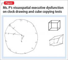 Ms. P scores 21 on the Montreal Cognitive Assessment (MoCA), indicative of significant cognitive impairment (normal score, ≥26). This is a 3-point decline on a MoCA performed during her admission 5 years earlier.