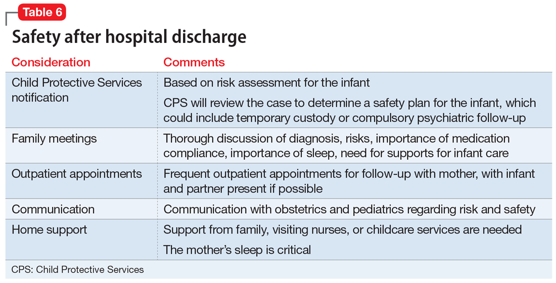 Discharge arrangements require careful consideration (Table 6). Meet with the family prior to discharge to provide psychoeducation and to underscore the importance of family involvement with both mother and infant. It is important to ensure adequate support at home, including at night, since sleep is critical to improved stability. Encourage the patient and her family to monitor for early warning signs of relapse, which might include refractory insomnia, mood instability, poor judgment, or hypomanic symptoms.35 She should be followed closely as an outpatient. Having her partner (or another close family member) and infant present during appointments can help in obtaining collateral information and assessing mother-infant bonding. The clinician should also consider whether it is necessary to contact CPS. Many mothers with mental illness appropriately parent their child, but CPS should be alerted when there is a reasonable concern about safe parenting—abuse, neglect, or significant risk.36