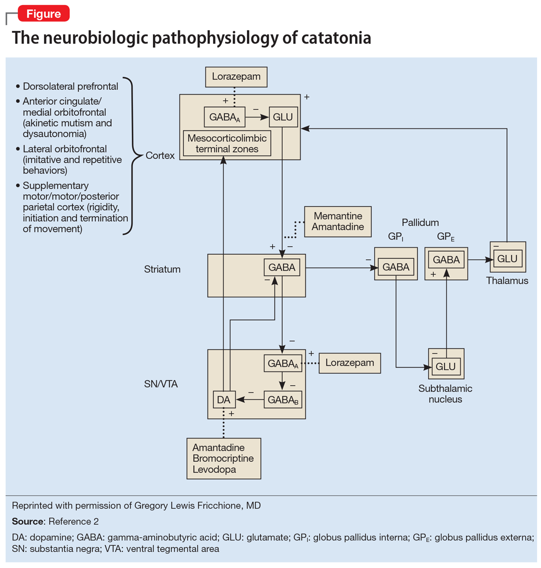 One helpful model for conceptualizing catatonia is to think of it as a basal ganglia disorder, with lesions in the basal ganglia thalamocortical tracts and the anterior cingulate/medial orbitofrontal circuit. Disrupting these pathways can result in symptoms such as mutism or repetitive and imitative behaviors. This is likely due to decreased disinhibition by gamma-aminobutyric acid (GABA), resulting in a hypodopaminergic state. This explains why benzodiazepines, which act to increase GABA, are effective for treating catatonia, and antipsychotics that act to decrease dopamine can exacerbate symptoms. Fricchione et al2 developed a model to visually represent the neurobiologic pathophysiology of catatonia (Figure2).