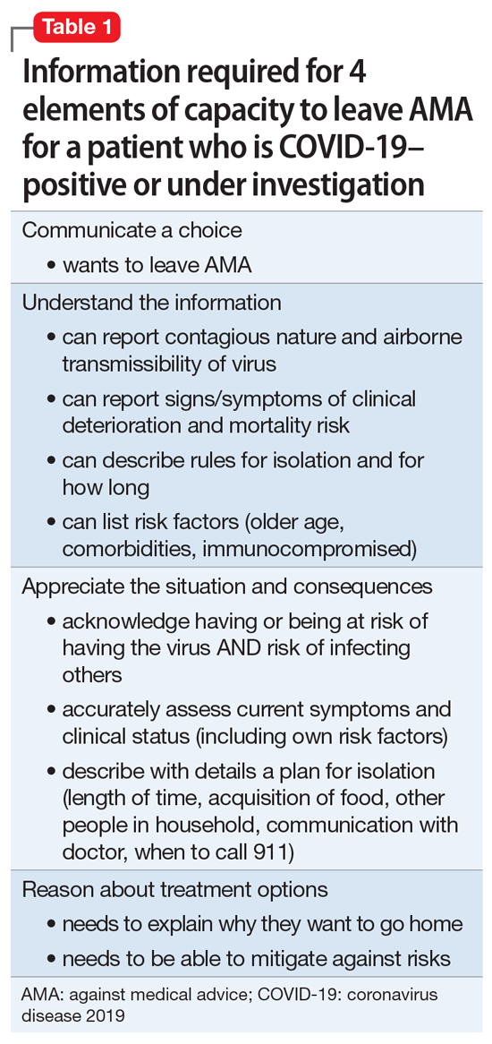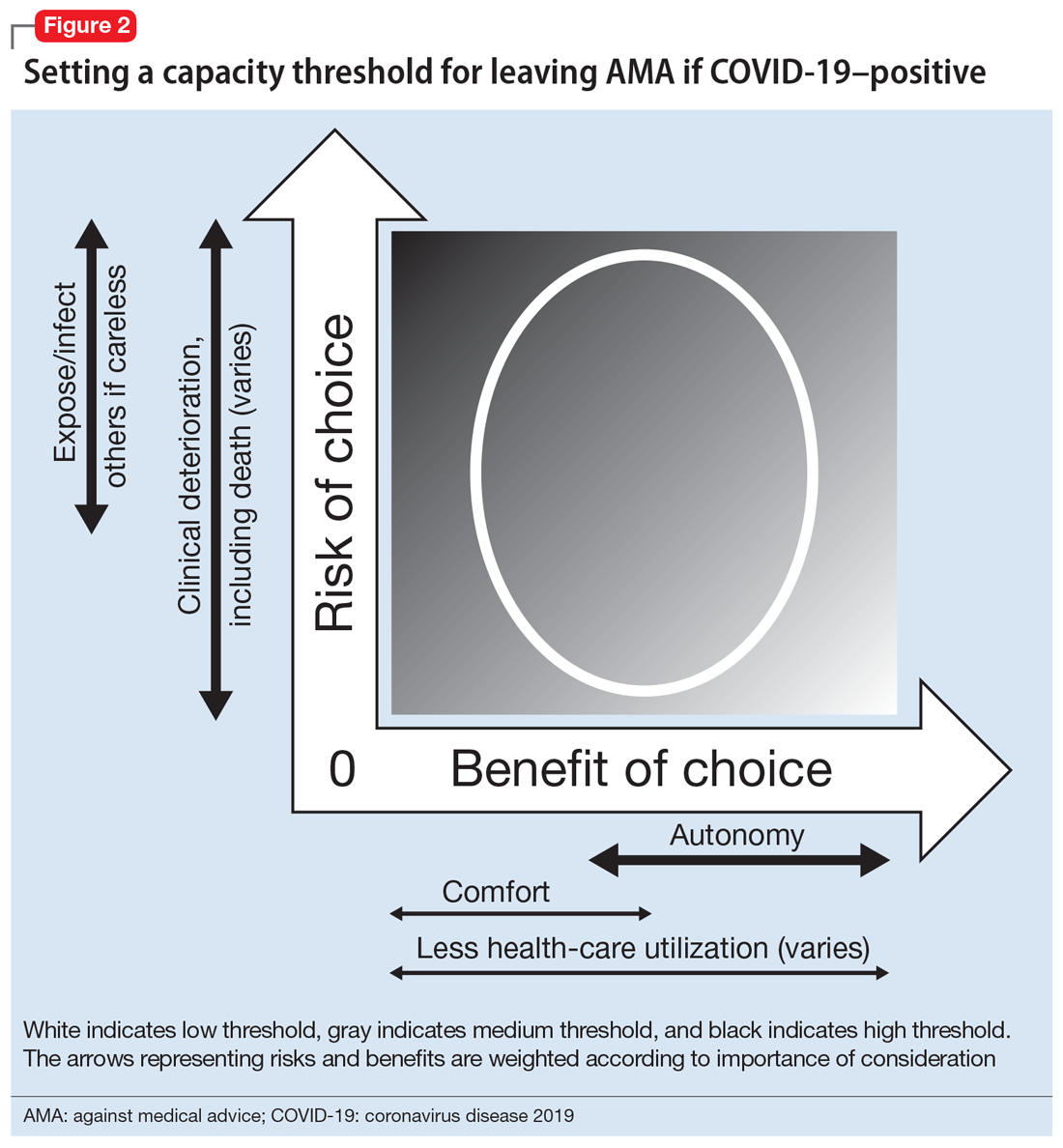 In the case of a patient who is COVID-19–positive, symptomatic, and wants to leave AMA, the threshold is automatically elevated because of societal-level risks (the risk of potential exposure or infection of others if a patient who is COVID-19–positive is not properly isolated). Furthermore, the individual risk of the patient leaving AMA depends on his/her age, comorbidities, and current clinical status; because of the uncertainty and rapid deterioration seen with COVID-19 illness, the calculated risk may actually be higher than for a non-COVID-19–related illness. Thus, in order to leave AMA, the patient’s responses must be fairly robust (Figure 2). Table 1 describes the information needed for robust understanding, appreciation, and reasoning.