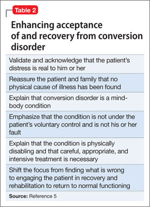 Treating a patient with a conversion disorder, somatic type starts with validating that the patient’s and parent’s distress is real to them (Table 2).5 The clinician acknowledges that no physical evidence of physiological dysfunction has been found, which can be reassuring to the patient and family. The clinician then states that the patient’s condition and the physical manifestation of the symptoms are real. A patient’s or parent’s resistance to this reassurance may indicate that they have a large investment in the symptoms and perpetuating the dysfunction.