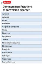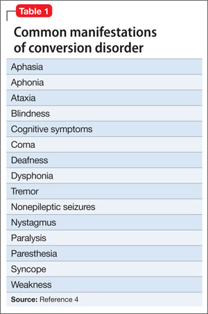 There are many examples in the literature of patients with conversion disorder (Table 1),4 ranging from pseudoseizures, which are relatively common, to intriguing cases, such as cochlear implant failure.5