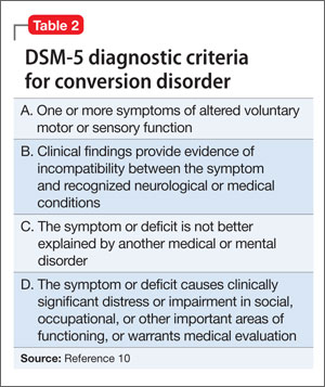 The relative uncertainty that accompanies a diagnosis of conversion disorder can be discomforting for clinicians. As demonstrated by Ms. G, as well as other case reports of conversion disorder, it takes time for the patient to find a clinician who will consider a diagnosis of conversion disorder.9 Largely, this is because DSM-5 requires that other medical causes be ruled out (Table 2).10 This often proves to be problematic because feigning, or the lack thereof, is difficult to prove.9