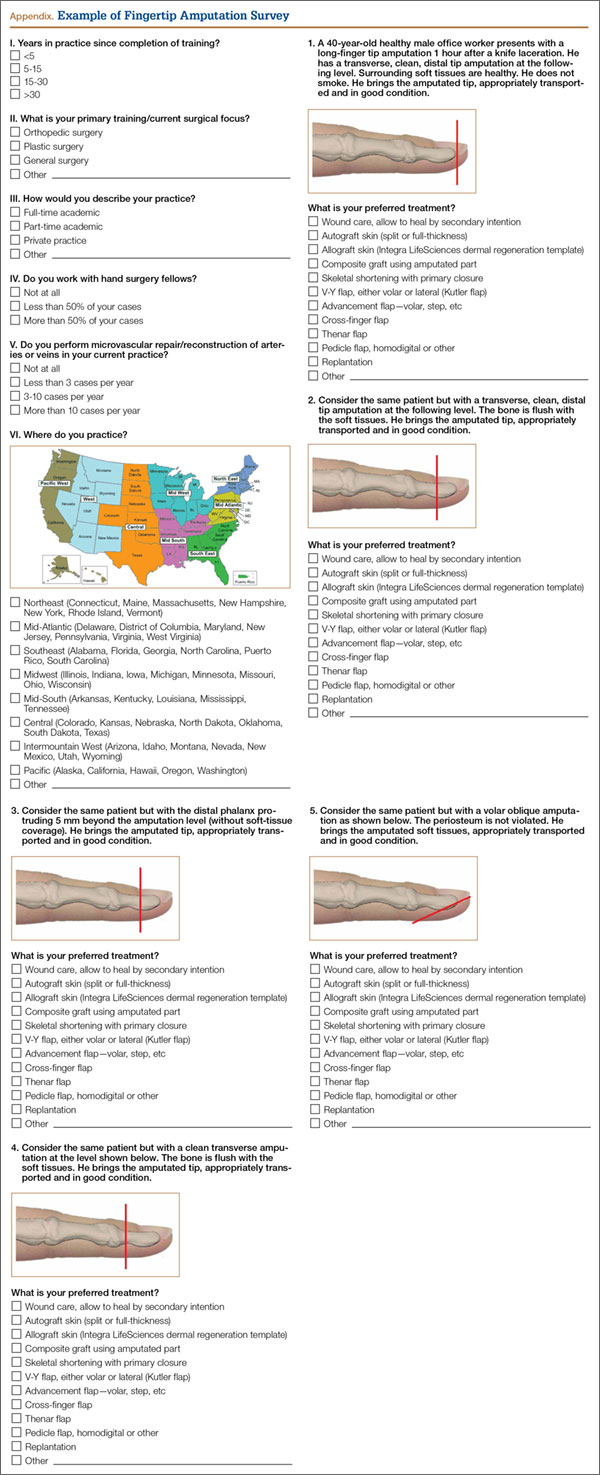 For distal fingertip amputations, there is little evidence supporting one approach over another. Without level I comparative data guiding treatment, anecdotal evidence and surgeon personal preferences likely contribute to the large variation noted in this survey. Our study results showed the disparity of fingertip treatment preferences among a cross section of US and international hand surgeons. More important, results underscored the need for a well-designed comparative study to determine the most effective treatments for distal fingertip amputations.