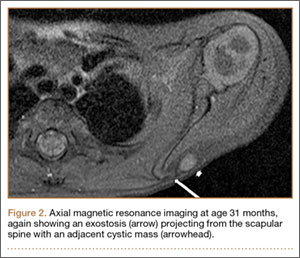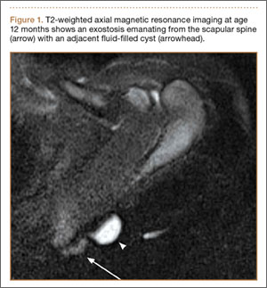 A 12-month-old boy presented to our clinic with the complaint of a mass over the left scapula. The mass was first noted incidentally several weeks earlier during bathing. Examination revealed a firm, subcutaneous, nontender mass measuring 1×2 cm located over the spine of the scapula. There were no overlying skin changes, and there was normal function of the ipsilateral upper extremity. Anteroposterior and lateral chest radiographs revealed no abnormality. Magnetic resonance imaging (MRI) showed an exostosis projecting from the scapular spine measuring 2×6×7 mm with an adjacent cystic mass measuring 5×8×9 mm that was thought to represent bursitis (Figure 1). The decision was made to observe the mass.