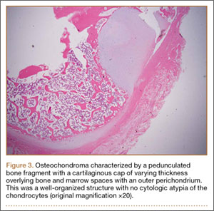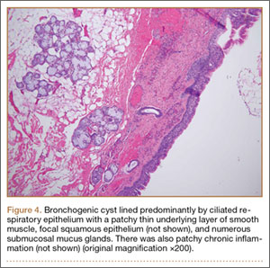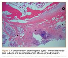 The fluid culture grew mixed flora, with no Staphylococcus aureus, group A streptococcus, or Pseudomonas aeruginosa identified. The pathologic examination identified bone with a cartilaginous cap, consistent with osteochondroma (Figure 3), as well as a cyst lined by respiratory epithelium with patchy areas of squamous epithelium and surrounding mucus glands, consistent with bronchogenic cyst (Figure 4). Figure 5 shows the contiguous nature of the 2 lesions.