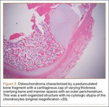 Osteochondromas are common benign bone tumors composed of a bony protrusion with an overlying cartilage cap.1 This lesion constitutes 24% to 40% of all benign bone tumors, and the great majority arise from the metaphyseal region of long bones.2 The scapula accounts for only 3% to 5% of all osteochondromas; however, this lesion is the most common benign bone tumor to involve the scapula.3