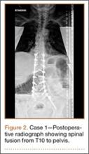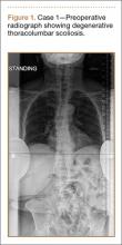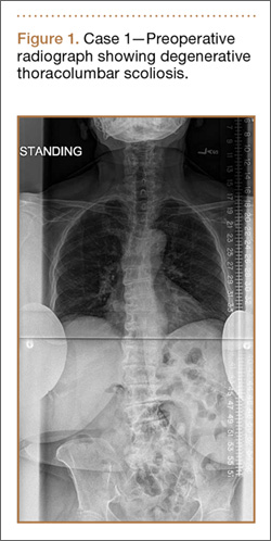 Clinical Presentation. A 78-year-old woman presented to the outpatient clinic with disability due to severe lower back pain. Her surgical history was significant for breast lumpectomy and cataract excision. Her medical history was significant for hypertension, obesity (body mass index, 31.5), hypercholesterolemia, emphysema, and anemia. She had undergone spinal surgery, specifically laminectomies from L2 to S1. The radiographic examination showed degenerative thoracolumbar scoliosis with severe spondylosis, disc space collapse, and ankylosis of L4-L5 (Figure 1).