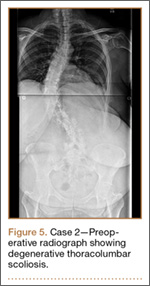 Clinical Presentation. A 51-year-old woman presented to the outpatient clinic with progressive low back pain and decompensation due to degenerative adult scoliosis. Her surgical history was significant for an uneventful Caesarean section. Her medical history was significant for borderline hypertension and obesity (body mass index, 34.4). The radiographic examination showed an S-shaped thoracolumbar curve from T4 to L4 (Figure 5).