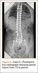 Operative Procedure. The patient underwent transpsoas lumbar interbody fusion (XLIF, NuVasive) from L1 to L4 and posterior spinal fusion from T10 to pelvis (Expedium, Depuy Synthes) (Figure 2). Operative time was 553 minutes; estimated blood loss was 2000 mL due to intraoperative coagulopathy (platelets, 40,000/µL) near the end of the posterior portion of the procedure. Intraoperative hypotension was treated by volume resuscitation and transient use of vasopressor agents. She was transfused with 1700 mL of blood, 150 mL of saline solution, and 420 mL of Lactated Ringer’s solution. No intraoperative complications occurred. The patient was extubated uneventfully on postoperative day 1 and was at baseline neurologically with no visual disturbances.